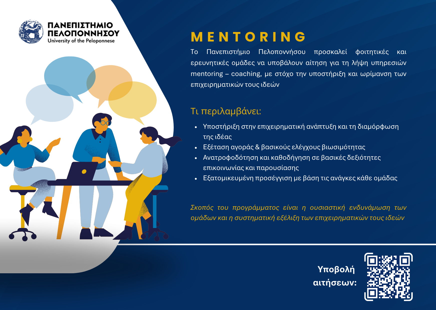 Στο πλαίσιο των δράσεων υποστήριξης της καινοτομίας και της αξιοποίησης ερευνητικών αποτελεσμάτων του Πανεπιστημίου Πελοποννήσου, παρέχεται η δυνατότητα σε φοιτητικές και ερευνητικές ομάδες να λάβουν υπηρεσίες mentoring – coaching, με στόχο την υποστήριξη και ωρίμανση των επιχειρηματικών τους ιδεών.